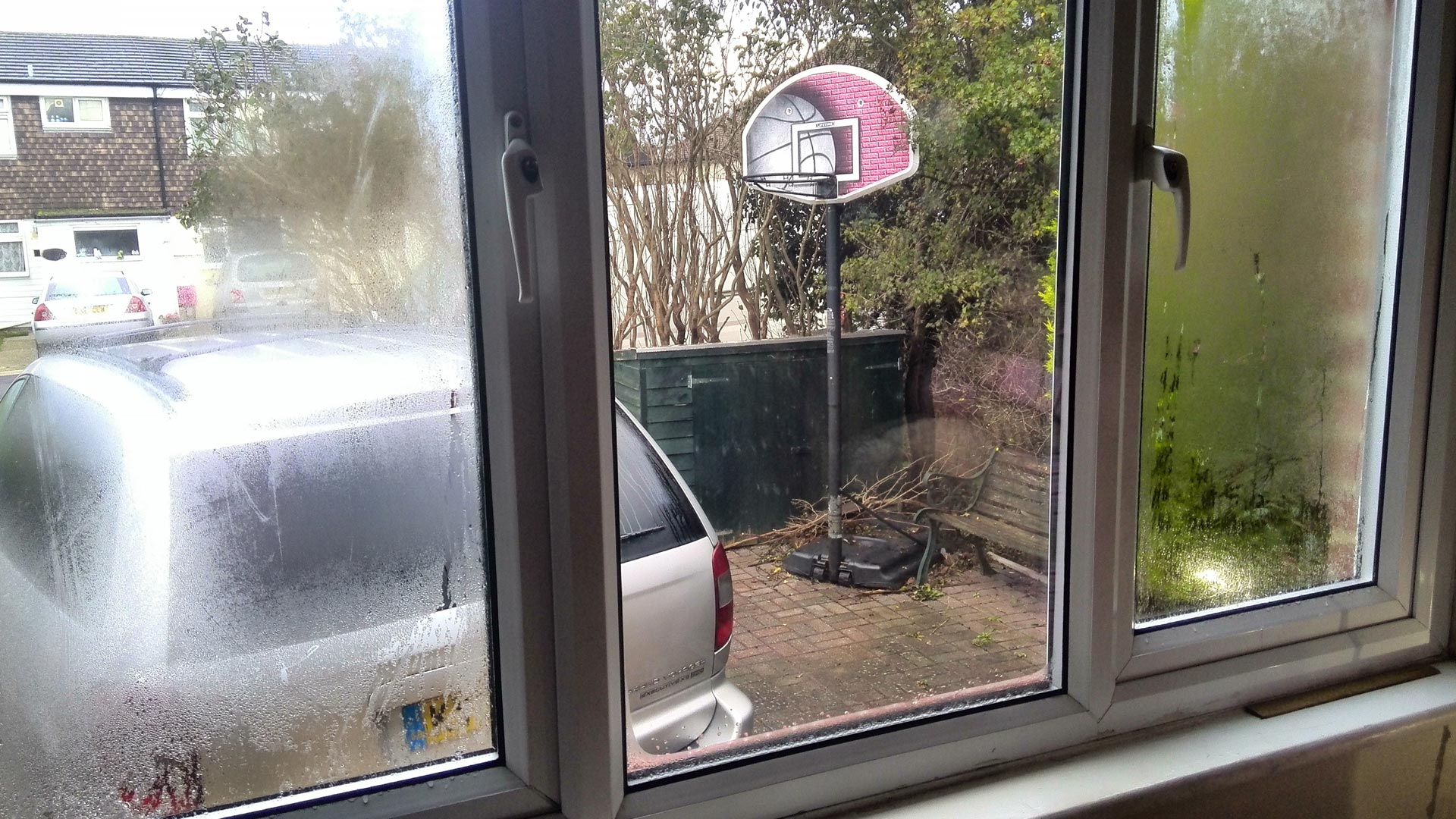 The above picture shows the difference between the centre pane being an “A Rated” unit, opposed to the glass either side being standard glass and covered in condensation.